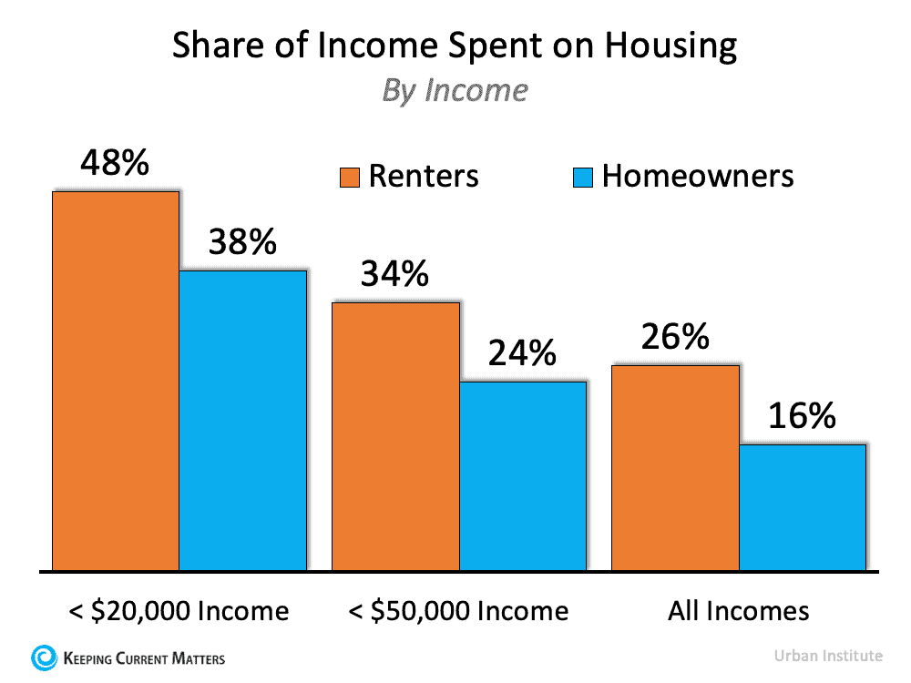 “When we look at the median housing expense ratio of all households, the typical homeowner household spends 16 percent of its income on housing while the typical renter household spends 26 percent. This is true, you might say, because people who own their own home must make more money than people who rent. But if we control for income, it is still more affordable to own a home than to rent housing, on average.”
