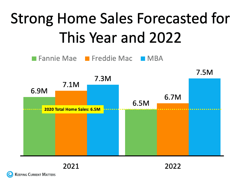 Fannie Mae, Freddie Mac, and the Mortgage Bankers Association (MBA) have all forecasted that total home sales (existing homes and new construction) will continue their momentum both this year and next. Here’s a graph showing those projections: