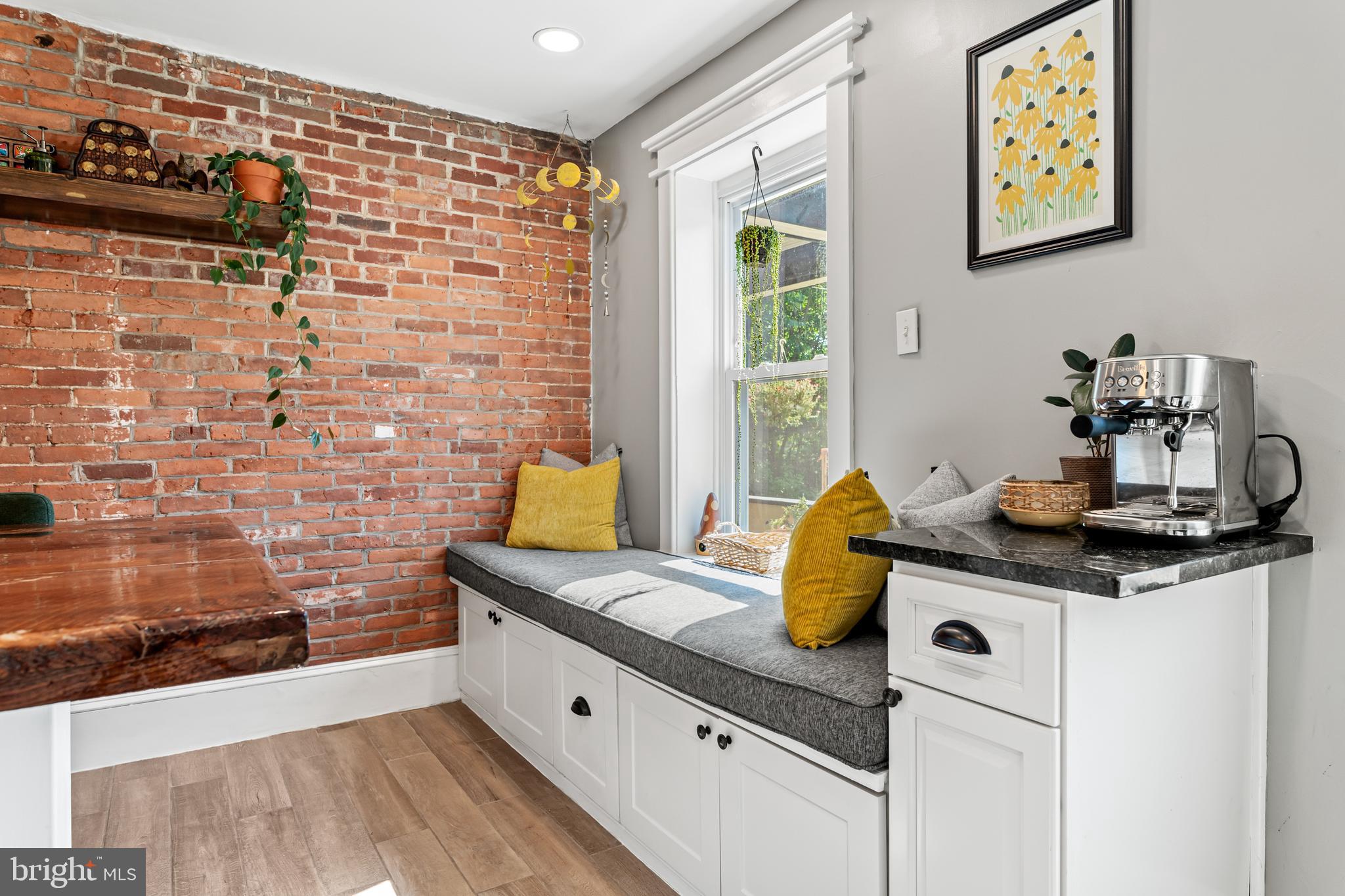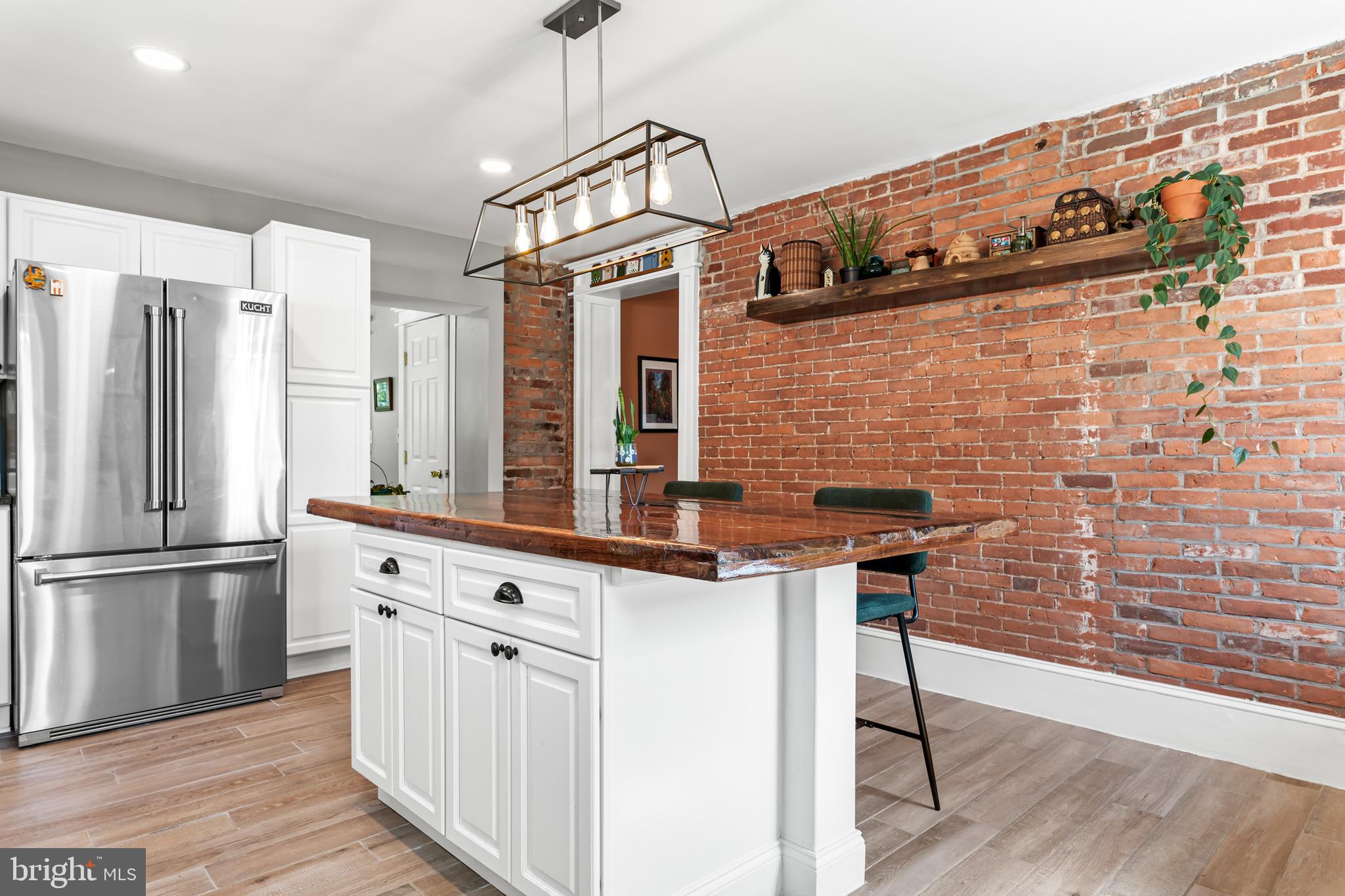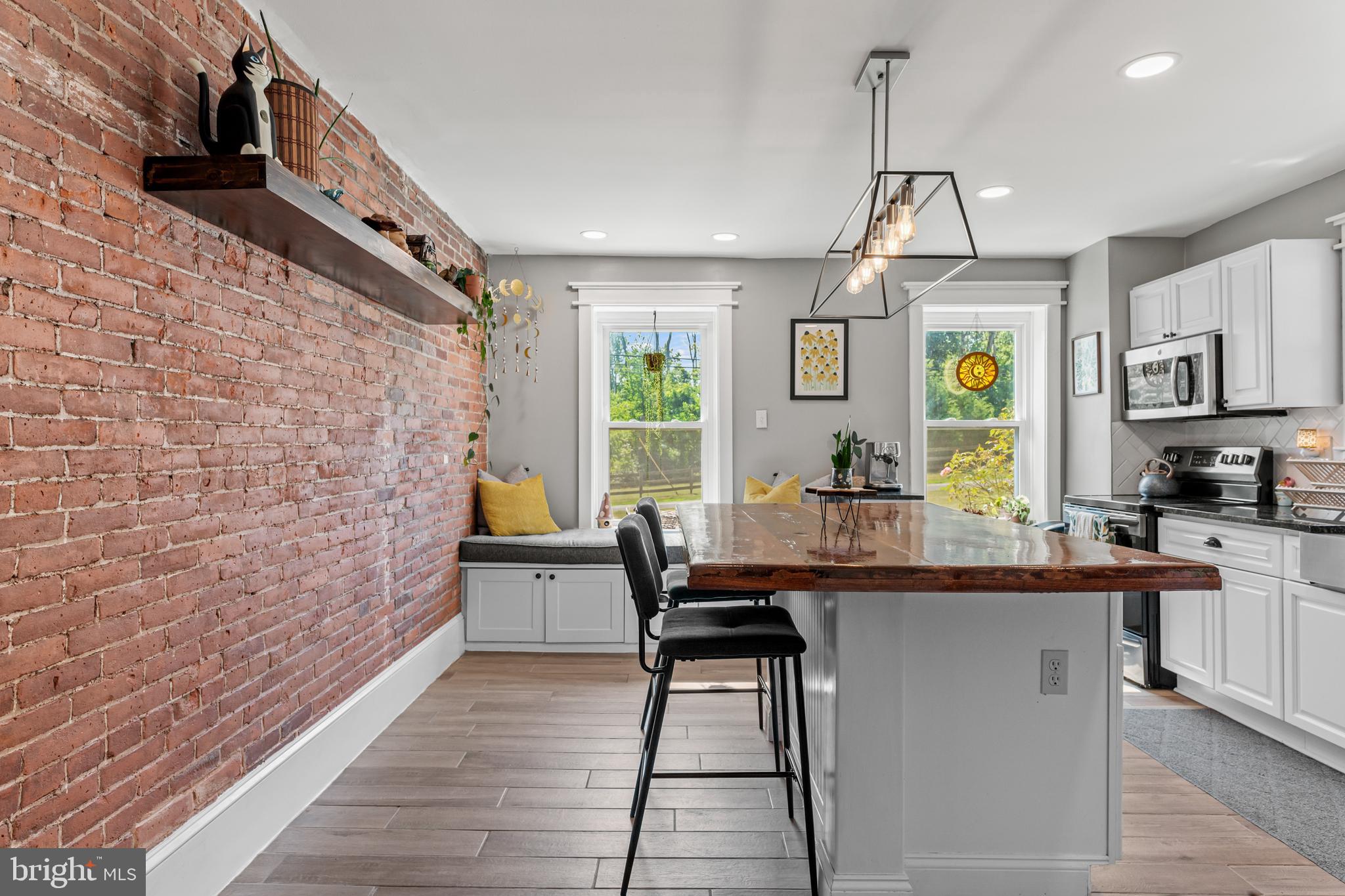 The mudroom flows effortlessly into the expansive kitchen, the true heart of this home. Imagine whipping up culinary delights surrounded by white cabinets, dark granite countertops, a herringbone tile backsplash, and a large center island with counter seating and a stunning custom-wood countertop. Recessed lighting and stylish farmhouse light fixtures illuminate the space, while a cozy built-in window bench with storage adds a touch of charm and a place to enjoy your morning coffee. The exposed brick wall with a real wood beam shelf complements the farmhouse aesthetic.