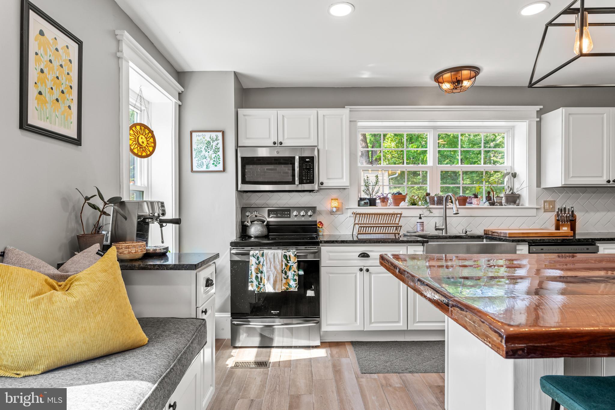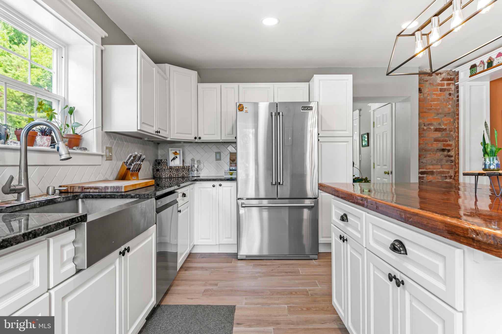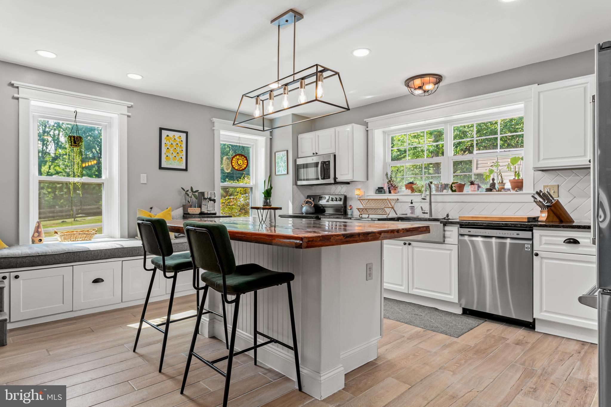 The mudroom flows effortlessly into the expansive kitchen, the true heart of this home. Imagine whipping up culinary delights surrounded by white cabinets, dark granite countertops, a herringbone tile backsplash, and a large center island with counter seating and a stunning custom-wood countertop. Recessed lighting and stylish farmhouse light fixtures illuminate the space, while a cozy built-in window bench with storage adds a touch of charm and a place to enjoy your morning coffee. The exposed brick wall with a real wood beam shelf complements the farmhouse aesthetic.