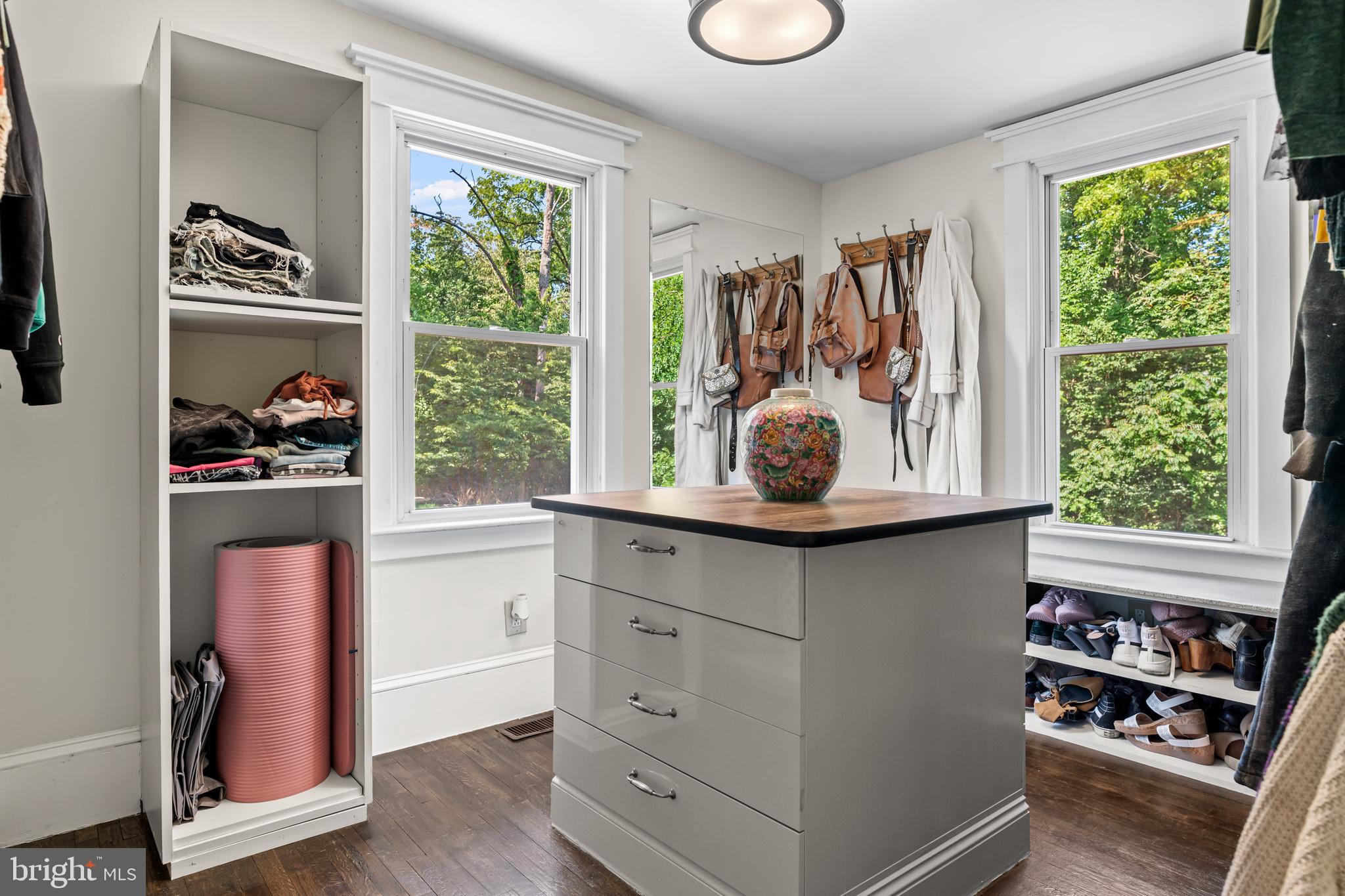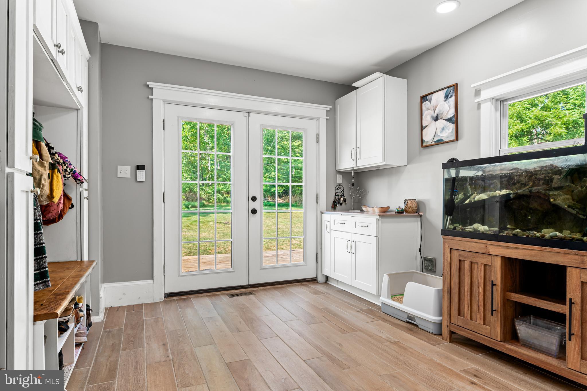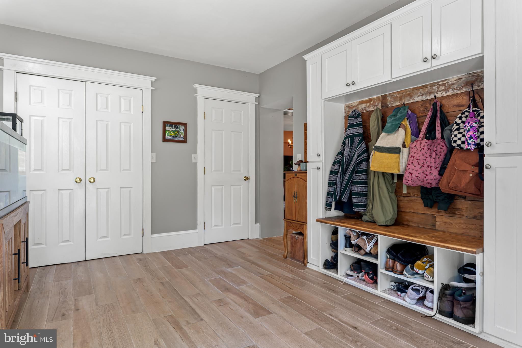 A welcoming covered front porch greets guests for special occasions but for everyday comings and goings, a charming flagstone path leads you to a more convenient side entrance. This mudroom boasts built-in storage and a pop of color on the accent wall, making it both functional and stylish. The mudroom also provides easy access to the main floor laundry room and powder room.