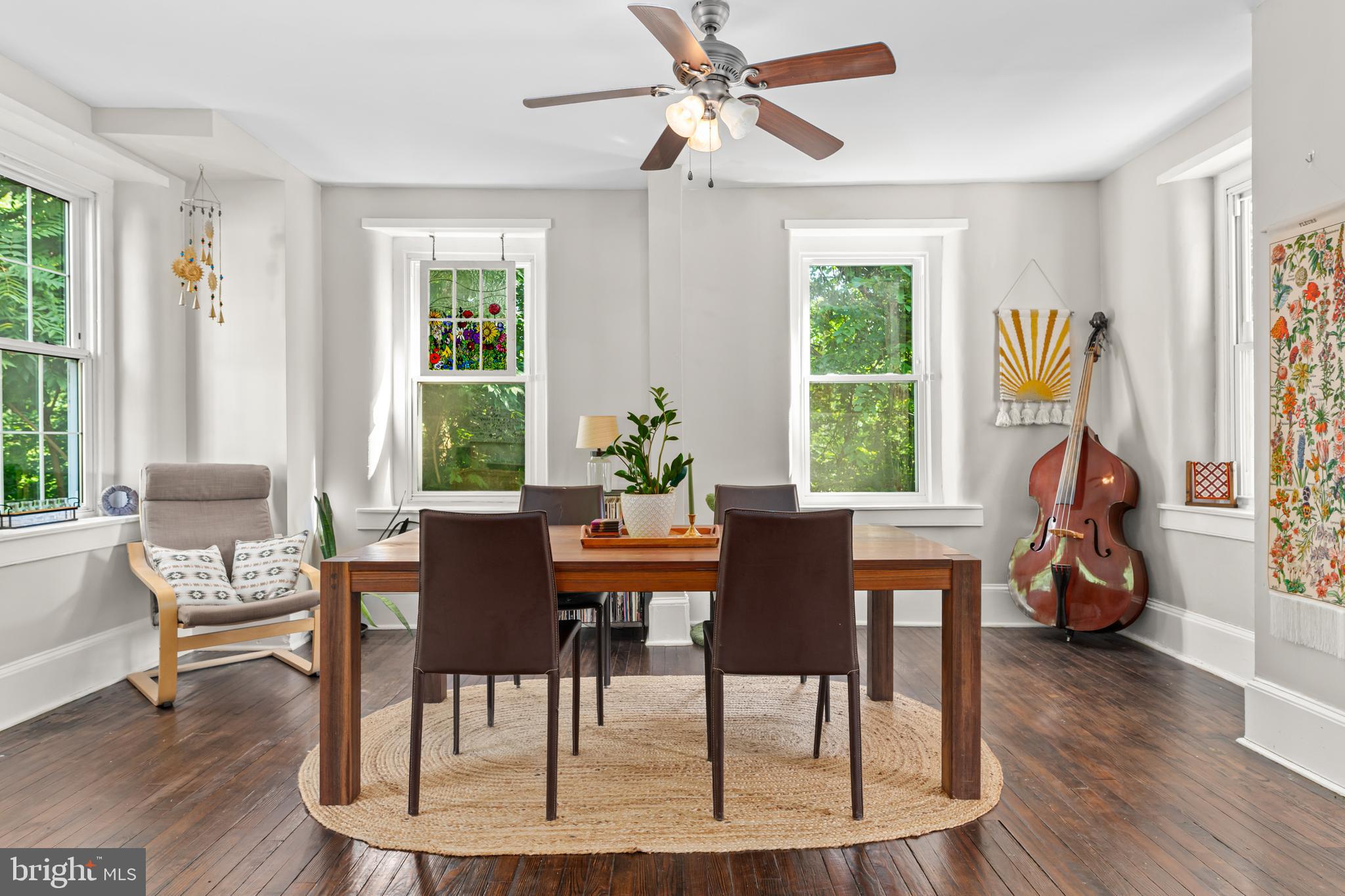 The open concept dining room and living room boast high ceilings and ample natural light from the large windows, creating a bright and inviting atmosphere.